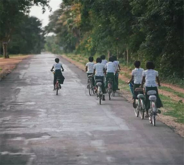 曼德勒附近,一群骑车归家的少女。在缅甸,自行车是最常见的交通工具之一