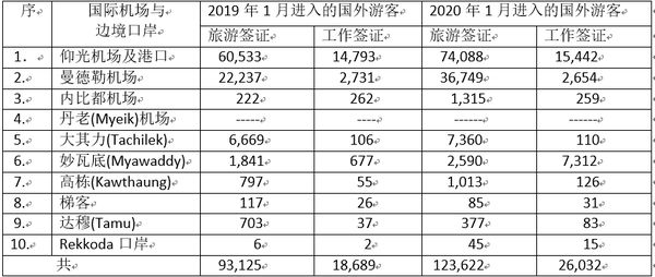 据2月11日出版的《缅甸之光》报报导,2020年1月份由各口岸进入缅甸的游客近15万人,比去年同期增加近4万人。具体数据如下表: