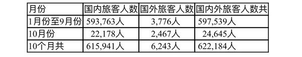 得林达依省区今年10个月游客人数统计表: