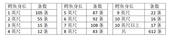 统计鳄鱼头数时,按照身长分类,由1英尺(约0.3米)、2英尺这样逐步统计,到10英尺(约为3米)及10英尺以上的头数分别如下: