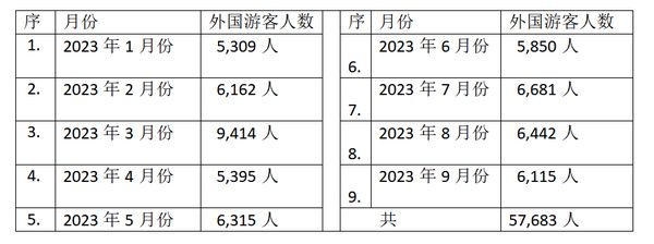 这9个月内共接待了国外游客57,683人的进入。除3月份外,7月份8月份进入的游客人数为第2、第3多,可能这期间是欧美西方国家学校、机关等放暑假的时期因而人数较多。游客最少的月份为1月及4月,4月份是缅甸泼水节,一些游客可能是“畏水如虎”,故而前来朝拜的人较少。
