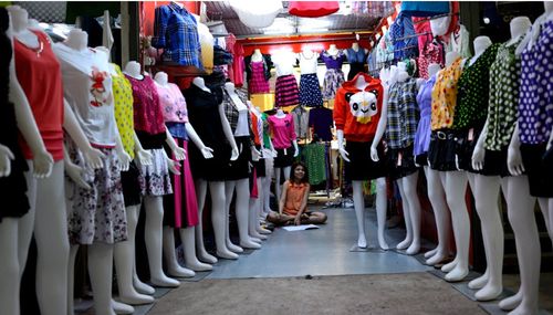 毛淡棉的商业区,一位女售货员坐在摆满模特的商店里。