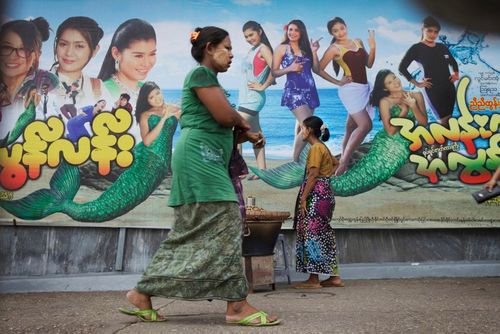 妇女穿着传统的缅甸腰布走在仰光现代电影广告牌前。