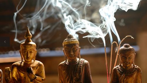 在莱茵湖旁的一个小村庄,木佛像摆在货摊上,后面还有正在燃烧的香火。