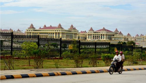 当地人骑着摩托车通过位于位于奈比多的联邦议会门前,这里是缅甸上、下议院代表召开会议的地方。