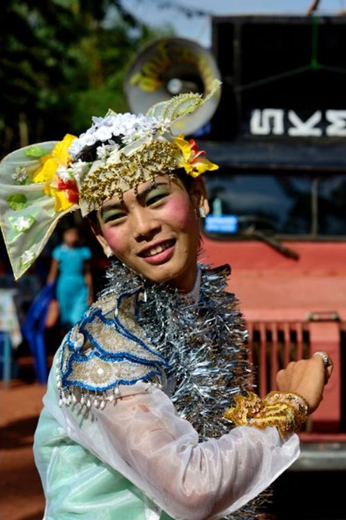 在毛淡棉,一位缅甸男孩将自己打扮成女孩的样子取悦邻居。
