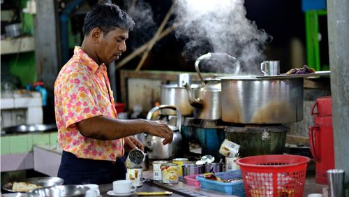 在毛淡棉,一位具有印第安血统的缅甸人正在泡茶。