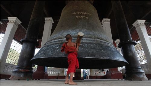 一位沙弥在敲敏贡大钟。它是世界上第三大钟,也是世界上还能够运转的最大的钟。