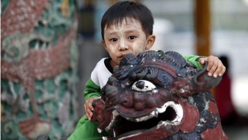 在神圣的仰光的大金塔,一位缅甸男孩爬上一尊石像鬼雕像。