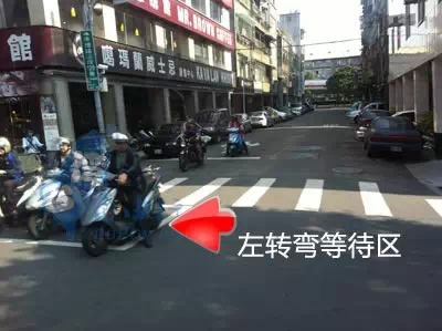 摩托车(台湾叫机车)、自行车左转弯时要分两次左转。在自己所在道路直行是绿灯时先停到右前方的待转区等待,等到自己前进方向是绿灯时再通过路口,完成左转。