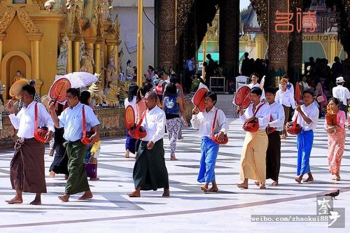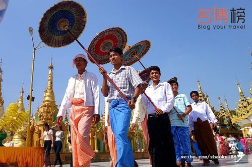 仰光大金塔佛教仪式上身着缅甸传统服饰的男人们。
