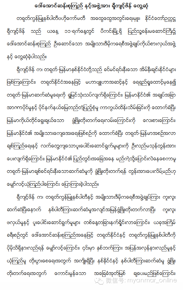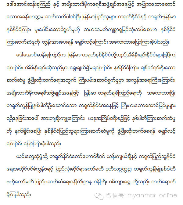 昂山素季说,缅中两国是邻居,而邻居是不可选择的,致力于两国友好关系发展至关重要。缅甸全国民主联盟重视缅中友好,钦佩中国共产党领导中国取得的巨大发展成就,希望通过此访深化两党关系,推动两国人民之间的友好关系向前发展。