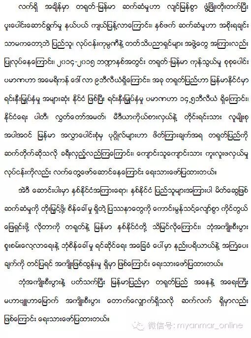 文章说,中缅建交65年来,虽然双边关系因国际战略局势和两国内政变化偶尔出现过波动,但在大部分时期都保持了稳定和友好。这笔珍贵的友谊遗产得益于两国早期领导人的远见和良好意愿。