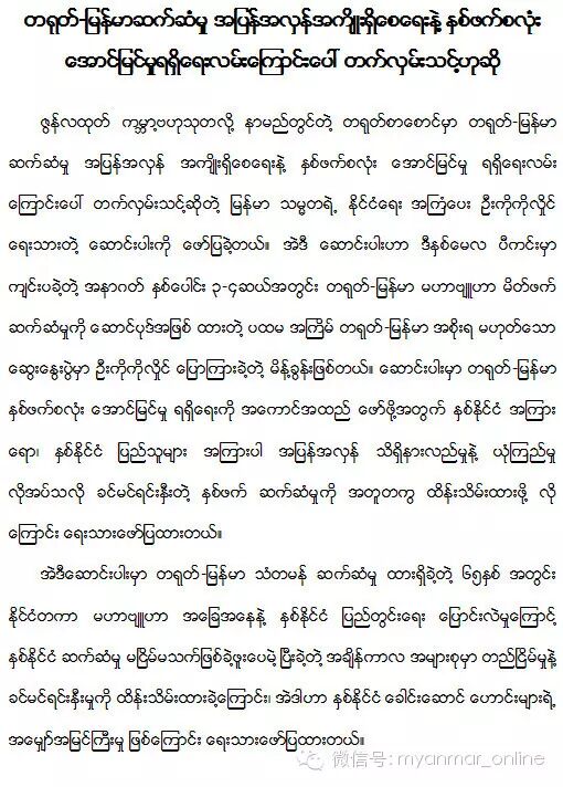 中国《世界知识》半月刊第11期刊登了缅甸总统首席政治顾问吴哥哥莱发表的题为“中缅关系要走互利双赢之路”的文章。这篇文章是他5月出 席在北京举行的以“未来几十年的中缅战略伙伴关系”为主题的首届中缅二轨对话上的发言。文章认为,实现中缅双赢,需要两国及两国人民间的相互理解和信任,需要共同维系友善的双边关系。作者为中缅关系发展提出八点建议。今天我们就来介绍这篇文章。