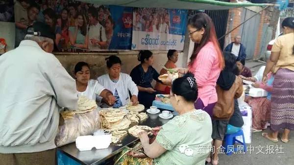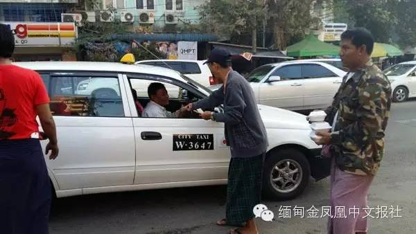 无论是行人、出租车还是三轮车,每人都能领到一份pae pyout(酿豆)和Nan Pya(烤饼),以及一张印有昂山将军头像的一缅元纸币。