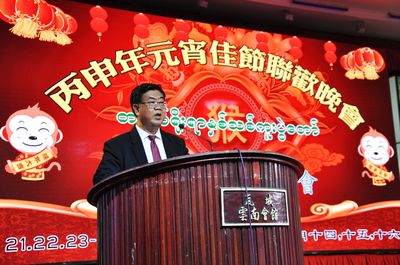 王愚总领事说云南同乡会秉承中华民族的优秀传统,做了很多善事,开办云华师范学院、为缅甸水灾及南山火灾捐款捐物等。王总领事表示在2016年要紧紧抓住中国一带一路的机遇,抓住缅甸新政府继续发展经济的机遇,把中缅两国的合作进一步深化,把中国两国利益纽带进一步深化,打造中缅两国的政治利益共同体,经济利益共同体。