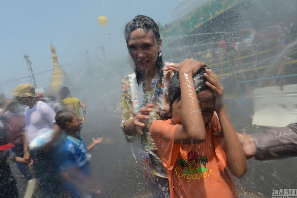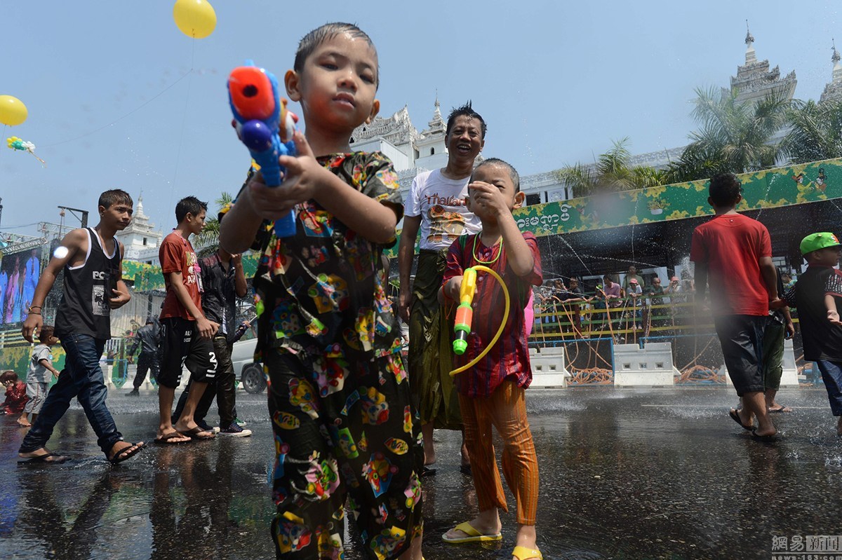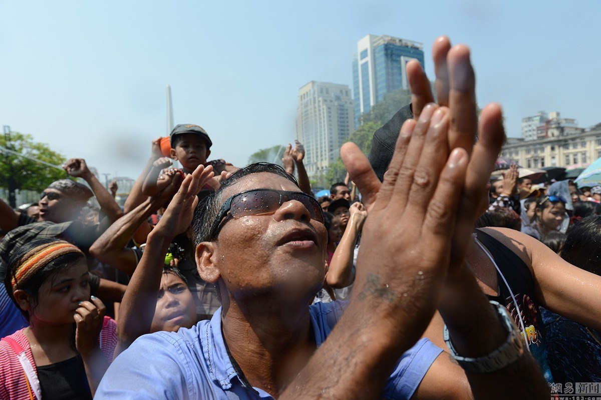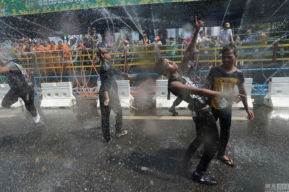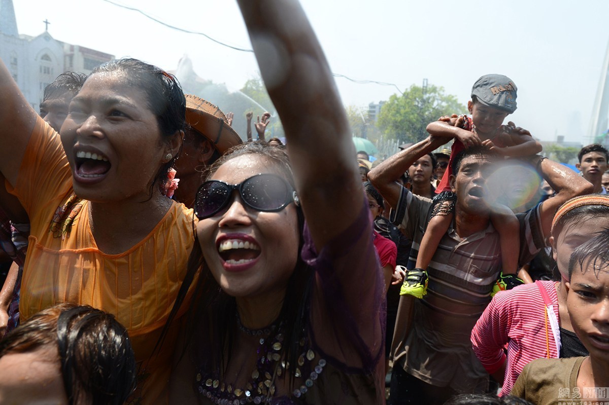 当地时间4月12日,缅甸仰光,新任总统吴廷觉与民众共同庆祝泼水节,迎接传统新年到来。