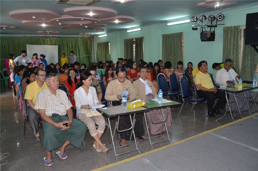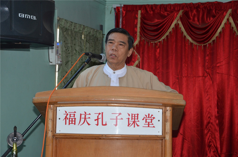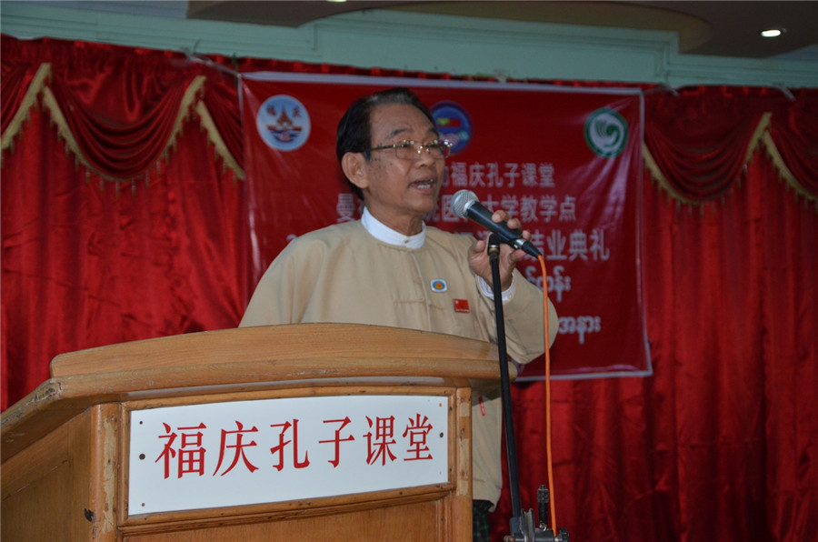 吴觉丹吞向在场的中国驻曼德勒中国驻曼德勒总领事馆靳仪麟副总领事、曼德勒省缅中友好协会主席吴博敏、缅甸传统医科大学副校长觉登泰博士、福庆学校校长李祖清博士、福庆孔子课堂中方主任李涛博士以及中文培训班师生等分享了自己在中国留学的经历。