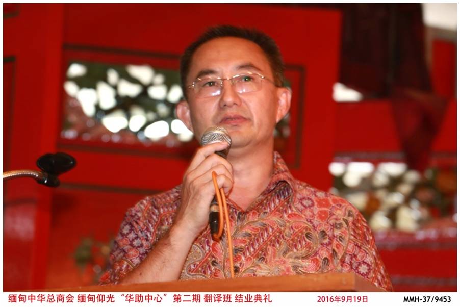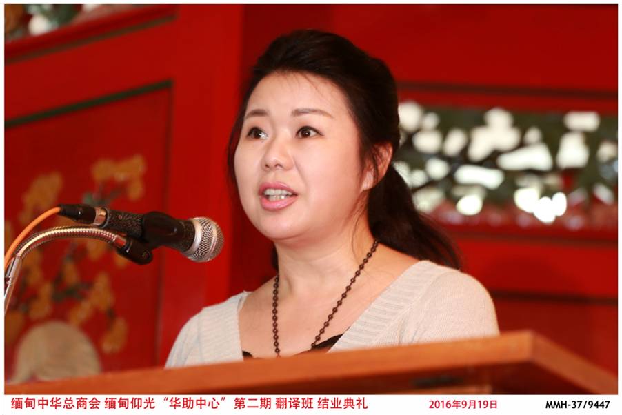 中国駐缅甸大使馆领事部蒋芳秘书表示,缅甸中华总商会在吴继垣会长的带领下,至成立仰光华助中心以来,开办了两期汉语培训班,为缅华社会培养了70多位汉语人才,对此我感到很欣慰。参加培训班的学生们,你们的选择是最正确、最明智的。2017年将是我们缅甸华人华侨特别有意义的一年,因为我们将举行第14 届世界华商大会,届时将有近2500多人聚集到仰光参加大会,这对我们缅甸华人华侨来说是一个难能的机遇,它将对缅甸经济发展带来巨大的贡献。为了明年的世界华商大会能取得圆满成功,充分展示缅甸华人华侨的风采以及缅甸悠久的历史和灿烂的文化,我们需要大批的有文化和有能力的年轻人来支持和加入,尤其需要大批翻译人才来为大会服务,这就是华助中心开办汉语培养班的宗旨和目的。我衷心希望,结业后的学生们能把握机遇,积极地参加和支持明年的世界华商大会,为世界华商大会做出贡献,同时也向全世界展示我们良好的素质和缅甸青年一代的风采,让世界了解缅甸,让缅甸了解我们华人。