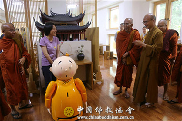 会见结束后,学诚大和尚与代表团成员合影留念。代表团随后饶有兴致地参观了龙泉寺的学修场所,并在动漫创作中心观看了佛教动漫作品,还与“贤二机器僧”愉快互动。
