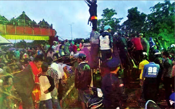 来自耶达谢县的、住家就在仰光—曼德勒公路旁的Zin Mar Myint(42岁)也说她是来彬文那(Pyinmana,现在的内比都)市场进货的,听到这里将颁发幸运奖,所以也就来排队了。这时民众人数越来越多,在早上5点半时广场第二进口的大门就由于人群过度拥挤而被撞开了,人群就涌进广场了。这时维持秩序的警方人员要求人群退出场外。在人群拥挤中,来自彬文那Thipinseik村的U Paw Yin及来自Thet Hnin Aye村的U Pauksa两人被推倒而受伤(没有生命危险),已将他们送往彬文那医院接受治疗。