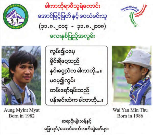 (按:四年前缅甸2名登山队员曾经登上这卡卡波亚希峰,但在回程路上这两名登山员Aung Myint Myat及Waiyan Min Thu失踪。当时包括中国的蓝天救援队在内的数支外国救援队曾前来帮忙寻找,但却一无所获,为缅甸登山队留下了“永恒之痛”。今年8月28日,缅甸登山队成员们在官方报纸《缅甸之光》报上刊登广告,沉痛地悼念这2名“卡卡波亚希英雄”。缅甸登山队再次挑战这东南亚第一高峰,除了是为最后确定谁是“东南亚第一高峰”问题之外,也含有继承战友们的遗愿完成他们未竟的工作目的。)
