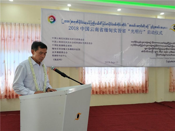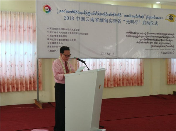 9月13日,2018中国云南省缅甸实皆省“光明行”启动仪式在实皆省敏目镇区提桑眼科医院隆重举行,王宗颖总领事出席并致辞。