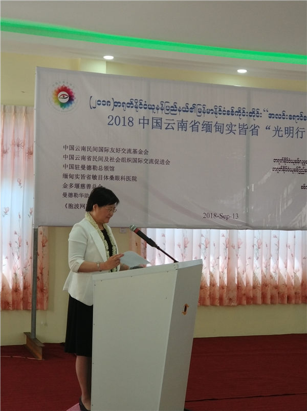 云南省友协会长周红在致辞中表示,云南省人民对外友好协会一直把增进中缅两国人民的友好作为一项重要的工作,自2014年开始至今,一共为缅甸1849名白内障患者成功实施手术,这次又将为300名白内障患者进行医治,还将为提桑眼科医院的医务人员开展医疗技术培训,并向提桑医院捐赠价值3600万缅币的医疗器械和400套病患服。