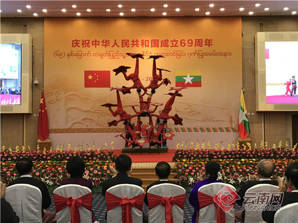 招待会始终洋溢着欢快友好的氛围,来宾们欢聚一堂共同祝愿中缅胞波情谊绵长悠远。云南省文化厅组派的云南文化艺术团展示了云南精品文艺节目,花灯歌舞《崴花灯》地方特色浓郁,演员唱、念、做、崴,情绪饱满,热闹欢腾。一首《我爱你中国》为祖国母亲献上诚挚的祝福,质朴的歌词把眷念祖国的无限深情抒发得淋漓尽致。杂技小演员用精湛技艺唯美描绘一幅《山花烂漫》之景,现场掌声雷动。