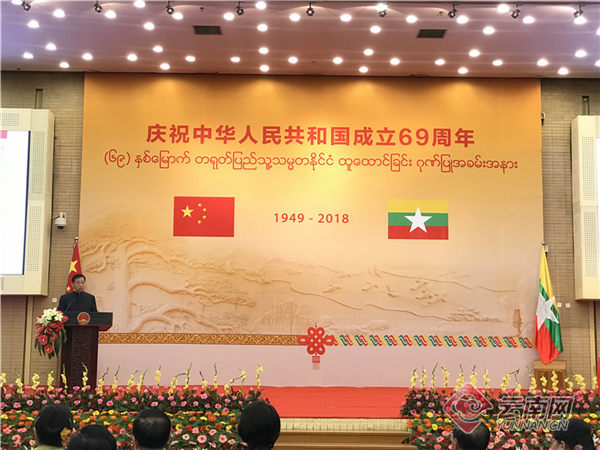 云南网讯(通讯员 李晨)当地时间9月26日晚,庆祝中华人民共和国成立69周年国庆招待会在内比都举行。中华人民共和国驻缅甸联邦共和国大使洪亮夫妇、缅甸联邦共和国第一副总统吴敏瑞夫妇以及缅甸政府、军队、议会、政党、驻缅使节以及侨团、中资企业、留学生、汉教志愿者、社会友好人士等各方面代表约800人出席。