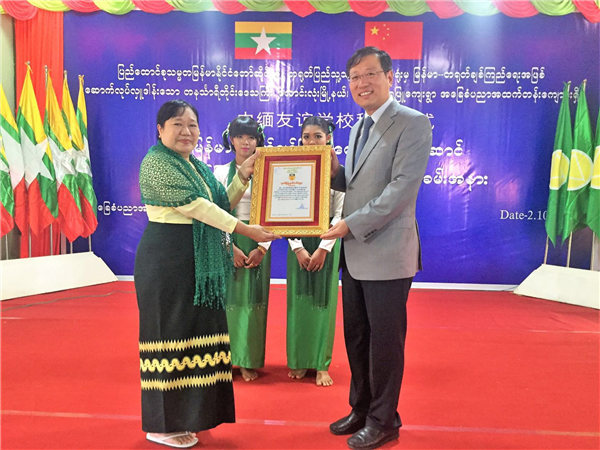 10月2日,由中国驻缅甸大使馆援建的第十九号中缅友谊学校揭牌仪式在德林达依省朗弄镇奥耶漂村中学举行。中国驻缅甸大使洪亮和夫人王雪鸿,德林达依省政府社会事务部部长吴和宾、农业水利部部长吴敏山、市政管理部部长吴漂敏通、少数民族事务部部长吴梭卢卡,德林达依省议会代表、朗弄镇和奥耶漂村官员和当地民众,以及学校师生共一千余人出席了揭牌仪式。