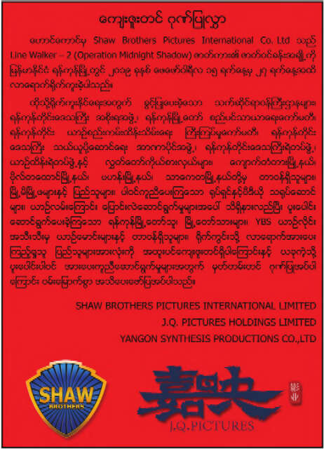 邵氏兄弟国际影业有限公司Shaw Brothers Picture International Co. Ltd来缅甸仰光取景拍摄电影Line Walker《使徒行者》的第二部,拍摄工作日期由2月15日至26日。现在在仰光取景拍摄的工作已完毕,在结束工作回返前,邵氏公司方面特别于2月28日在官方报纸《缅甸之光》报上刊登全版广告,感谢在拍摄工作期间,给予各方面帮助的有关人士。