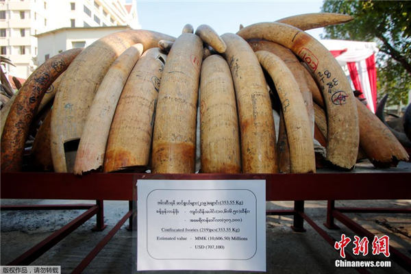 缅甸警方将销毁缴获的非法野生动物制品 象牙堆积如山