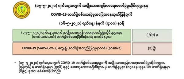 5月15日下午,仰光国家卫生化验室对第一批及第二批的279名人员的化验样本进行化验检查,医药科研所(DMR)对 148名人员的化验样本进行化验检查,共427人的化验样本中,没有发现任何人的样本中含有新冠病毒。