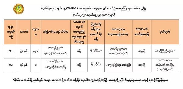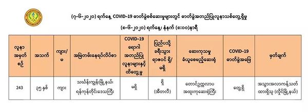至此,缅甸国内新冠病毒确诊人数增加到243人。