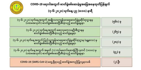 6月7日下午,仰光国家卫生化验室(NHL)对第一批的560名人员的化验样本进行化验检查,医药科研所(DMR)对 265名人员的化验样本进行化验检查, 曼德勒人民卫生化验室对283名人员的化验样本进行化验检查, 第一军医1000床位医院对第一批92名人员的化验样本进行化验检查,共1200人的化验样本中,发现2人的样本中含有新冠病毒。