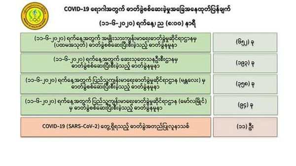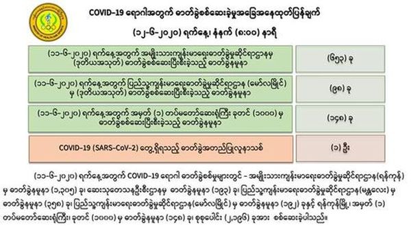 6月11日各化验室的化验情况:仰光国家卫生化验室对1305名人员的化验样本进行化验检查,医药科研所对193名人员的化验样本进行化验检查, 曼德勒人民卫生化验室对358名人员的化验样本进行检查,毛淡棉人民卫生化验室对192名人员的化验样本进行化验检查,仰光第一军医1000床位医院对148名人员的化验样本进行检查,共2196份化验样本中,发现12人的样本中含有新冠病毒。