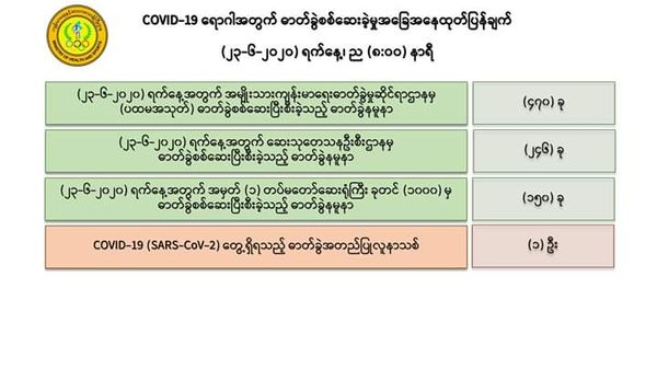 6月23日下午,仰光国家卫生化验室(NHL)对第一批的470名人员的化验样本进行化验检查,医药科研所(DMR)对 246名人员的化验样本进行化验检查,仰光第一军医1000床位医院对150名人员的样本进行化验检查,共866人的化验样本中,发现有1人的样本中含有新冠病毒。