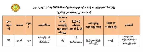 至此,缅甸国内新冠病毒确诊人数增加至292人。