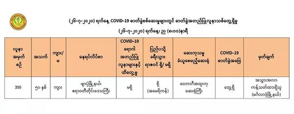 至此,缅甸国内新冠病毒确诊人数增加到350人。