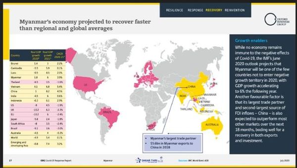 牛津商业集团在7月底发布的报告也指出,由于中国经济的快速复苏,缅甸的经济复苏将比区域内其他国家要快。牛津商业集团主编奥利弗·科诺克(Oliver Cornnock)表示,作为近年来增长最快的市场之一,缅甸正在从新冠肺炎疫情中恢复过来, 缅甸经济复苏的速度超过了所在区域和国际平均水平。
