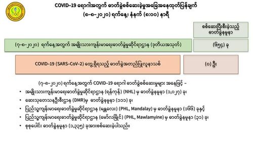 8月7日,仰光国家卫生化验室(NHL)对第一批 373名人员的化验样本进行化验检查,医药科研所对111名人员的化验样本进行化验检查,曼德勒人民卫生化验室(PHL, Manaday)对166名人员的化验样本进行化验检查,毛淡棉人民卫生化验室(PHL, Mawlamyine)对31名人员的化验样本进行化验检查,共681人的化验样本中,没发现任何人的样本中含有新冠病毒。