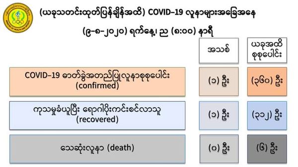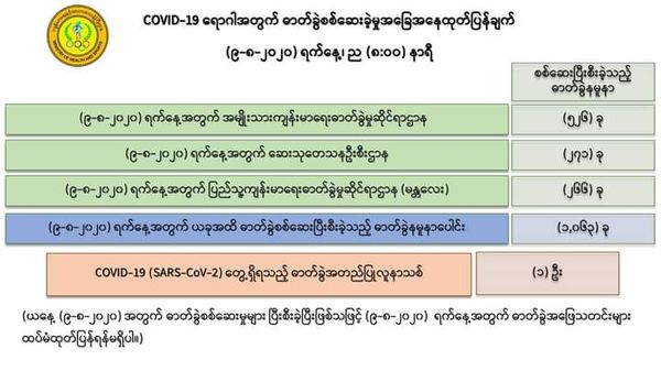 8月9日,仰光国家卫生化验室(NHL)对526名人员的化验样本进行化验检查,医药科研所对271名人员的化验样本进行化验检查,曼德勒人民卫生化验室(PHL, Manaday)对266名人员的化验样本进行化验检查,共1063人的化验样本中,没发现任何人的样本中含有新冠病毒。