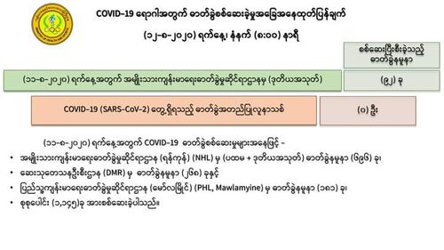 8月11日,仰光国家卫生化验室(NHL)对第一批604名人员的化验样本进行化验检查,医药科研所对268名人员的化验样本进行化验检查,毛淡棉人民卫生化验室(PHL, Mawlamyine)对181名人员的化验样本进行化验检查,仰光第一军医1000床位医院对88位人员的化验样本进行化验检查,共1053人的化验样本中,没发现任何人的样本中含有新冠病毒。