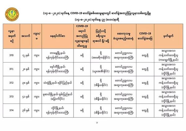 至此,缅甸国内新冠病毒确诊人数增加到374人。