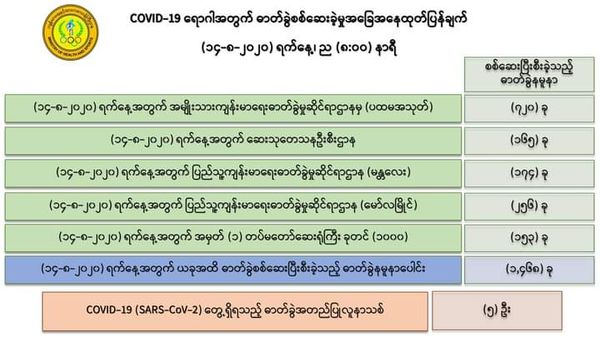 8月14日,仰光国家卫生化验室(NHL)对第一批720名人员的化验样本进行化验检查,医药科研所对165名人员的化验样本进行化验检查,曼德勒人民卫生化验室(PHL, Mandalay)对174名人员的化验样本进行化验检查,毛淡棉人民卫生化验室(PHL, Mawlamyine)对256名人员的化验样本进行化验检查,仰光第一军医1000床位医院对153名人员的化验样本进行化验检查,共1468人的化验样本中,发现有5人的样本中含有新冠病毒。