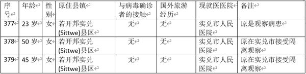 发现3名新确诊者,而且都是在若开邦实兑市,病患们没有国外旅游历史,与国内确诊者也没有接触,但是不是与那第375号确诊者有关联,卫体部公告没有说明,人们不由得感到有些疑惑。由于第375名确诊者是CB银行的工作人员,在这期间曾到达皎漂、蓬那遵等地区,有关部门对这些地区与之有接触过的人员收集了有关化验样本送往仰光化验室进行化验,这是有必要的。现在实兑市的3名新确诊者,是这些人员中的吗,还是由另外的渠道感染此病毒,显然有必要加以说明,但现在在公告中没有见到这一说明。