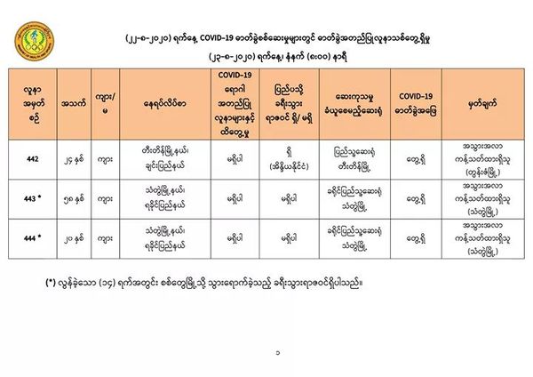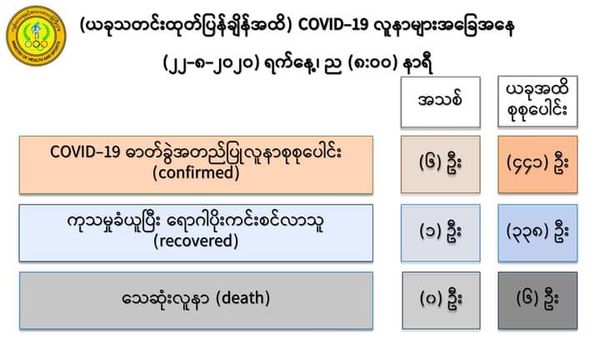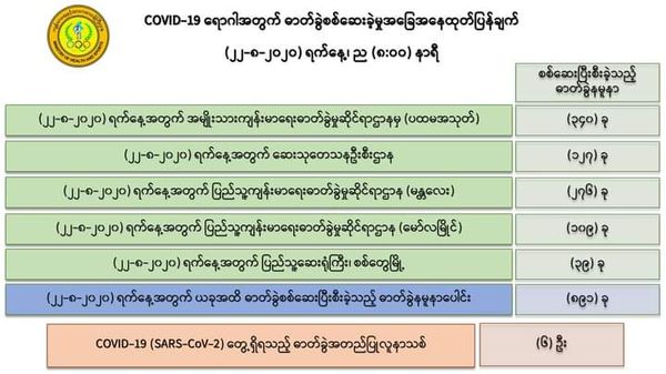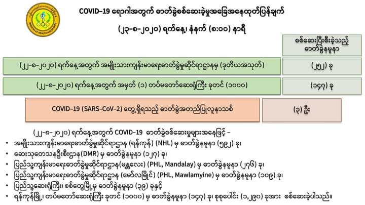 8月22日,仰光国家卫生化验室(NHL)对第一批340名人员的化验样本进行化验检查,医药科研所(DMR)对127名人员的化验样本进行化验检查,曼德勒人民卫生化验室(PHL, Mandalay)对276名人员的化验样本进行化验检查,毛淡棉人民卫生化验室(PHL, Mawlamyine)对109名人员的化验样本进行化验检查,实兑市人民医院化验室对39名人员的化验样本进行化验检查,共891人的化验样本中,发现有6人的样本中含有新冠病毒。