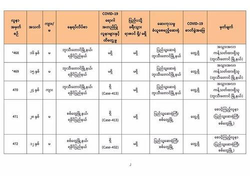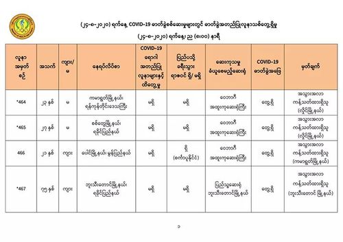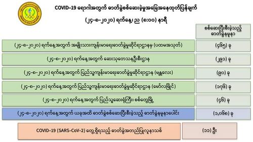 8月24日,仰光国家卫生化验室(NHL)对第一批465名人员的化验样本进行化验检查,医药科研所(DMR)对 291名人员的化验样本进行化验检查,曼德勒人民卫生化验室(PHL, Mandalay)对90名人员的化验样本进行化验检查,毛淡棉人民卫生化验室对对176名人员的化验样本进行化验检查,实兑市人民医院对46名人员的化验样本进行化验检查,共1068人的化验样本中,发现有11人的样本中含有新冠病毒。