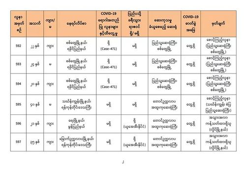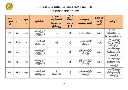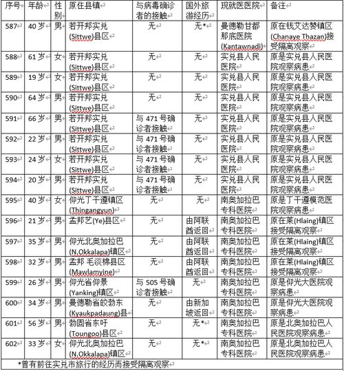 一天之内再发现42名新确诊者,先公布16人的资料,这16人中,有8人是属于若开邦实兑县民众,7人现在在实兑市,1人已到达曼德勒市,在曼德勒市接受防疫检测,发现病毒后移送到曼德勒市甘都那底医院接受治疗护理。另外8人来自各省邦地区,但4人是由国外回归(3人由阿联酋,1人由新加坡),他们在仰光机场就已直接被送往有关镇区接受隔离观察,检测出病毒后直接送往南奥加拉巴专科医院接受治疗护理。最后4人中又有2人有前往实兑市旅游的经历,可见实兑市也已是缅甸新冠疫情来源地之一了。
